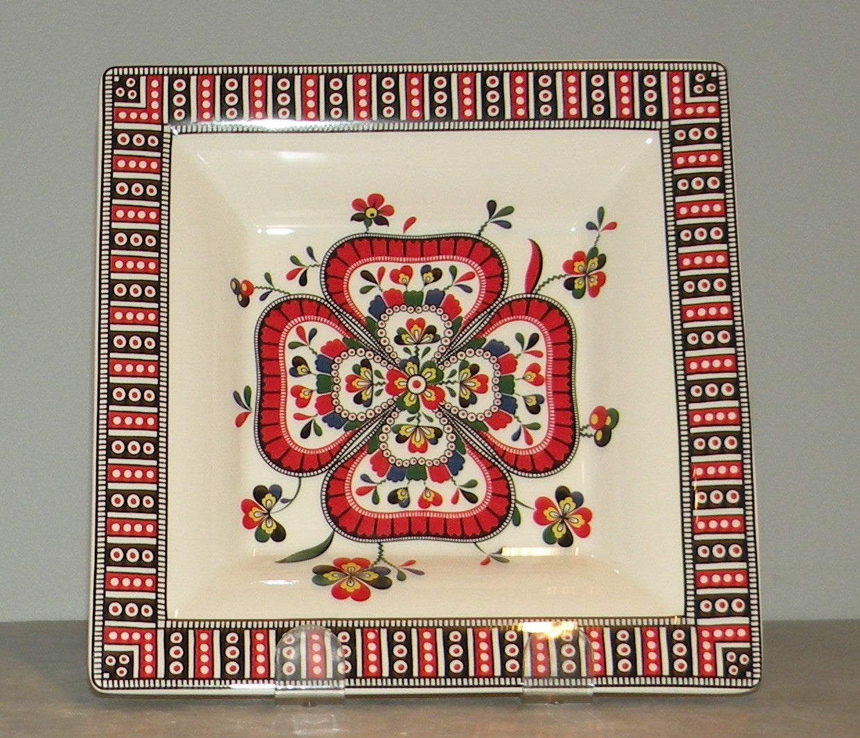 The décor, with its highly colorful design and central clover motif, invites cheerfulness and optimism.